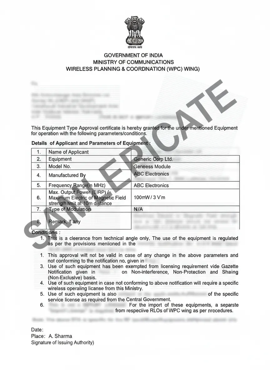 The WPC ETA certificate is the most common certification for wireless devices operating in de-licensed frequency bands. This includes Bluetooth devices, WiFi equipment, RFID systems, and other wireless communication devices. The ETA approval validates that your wireless product meets Indian technical standards.